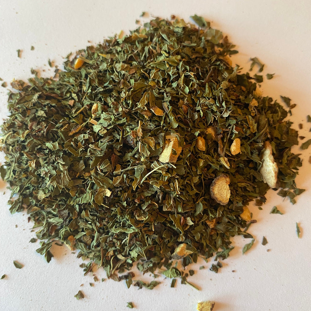 Peppermint and spearmint have long been used to support digestive comfort and ease heaviness. Licorice root brings natural sweetness and balance, helping to soothe and harmonize the blend. Chopped ginger and clove offer subtle warmth, encouraging digestive movement and helping the body awaken with intention.