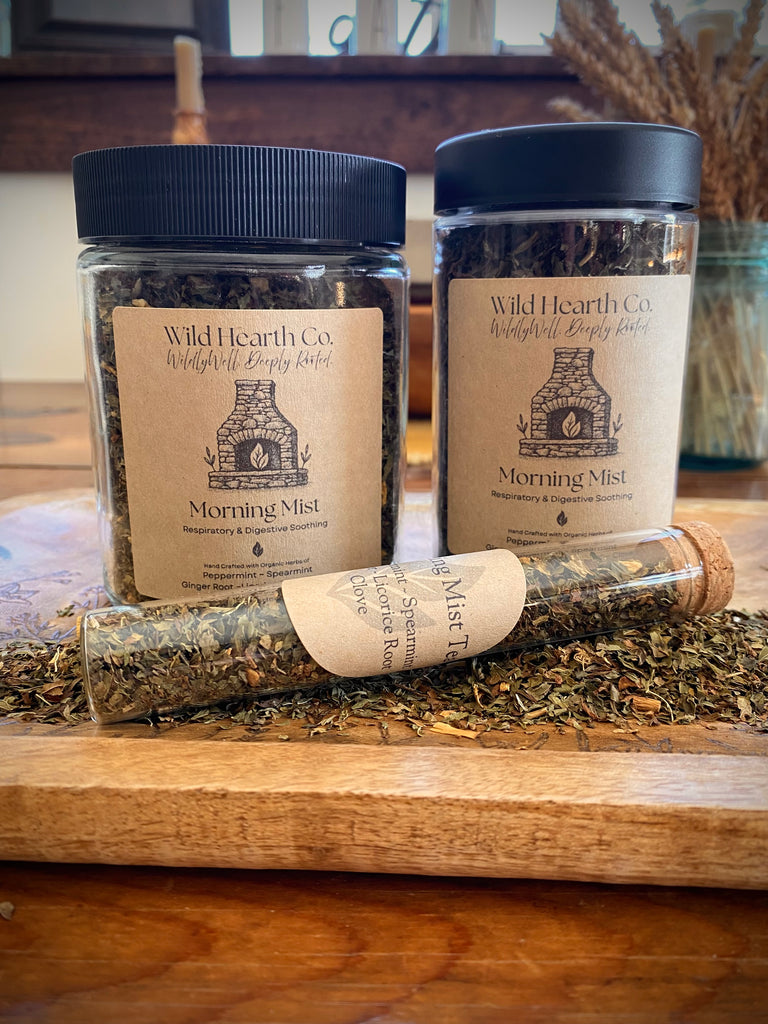 Morning Mist is a steady, warming herbal tea crafted to support digestion and bring gentle clarity to the start of the day. Cooling mints rise first, clearing the palate and refreshing the breath, while deeper roots and spices follow with grounding warmth.